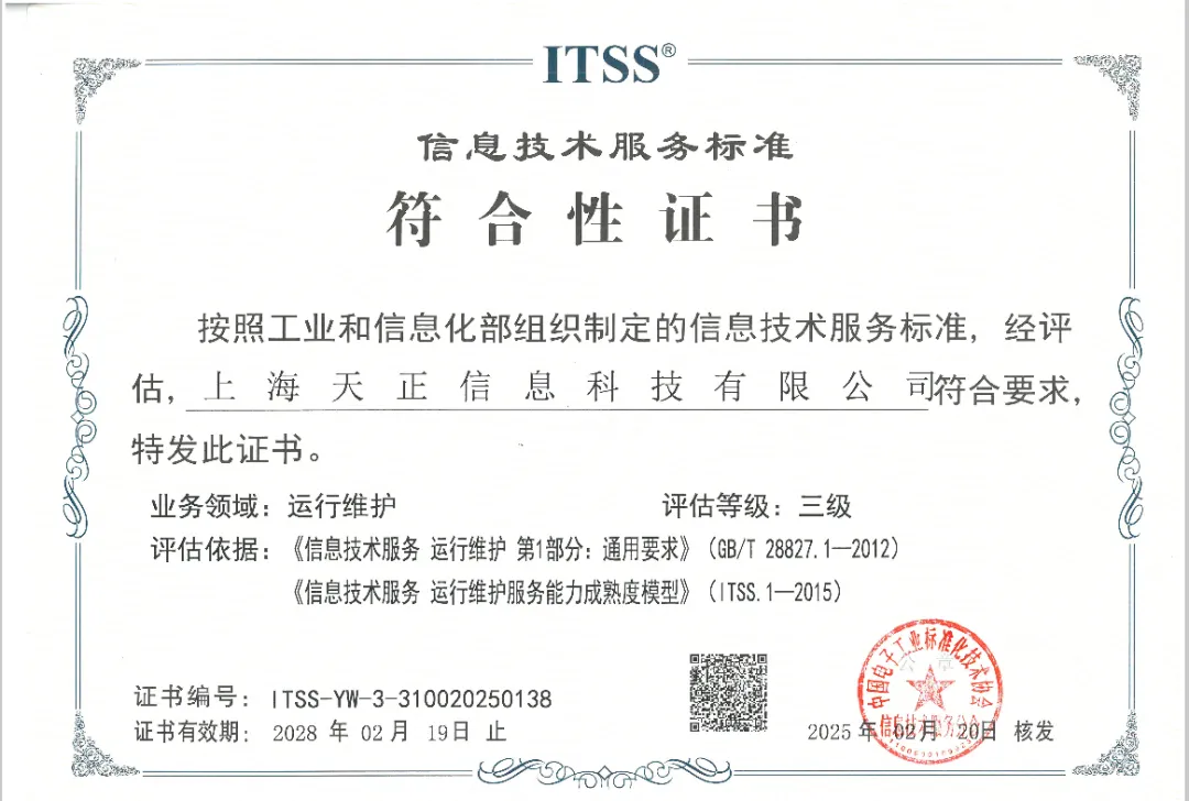 喜報(bào)!熱烈慶祝天正信息成功通過ITSS三級認(rèn)證,邁向服務(wù)新高度!